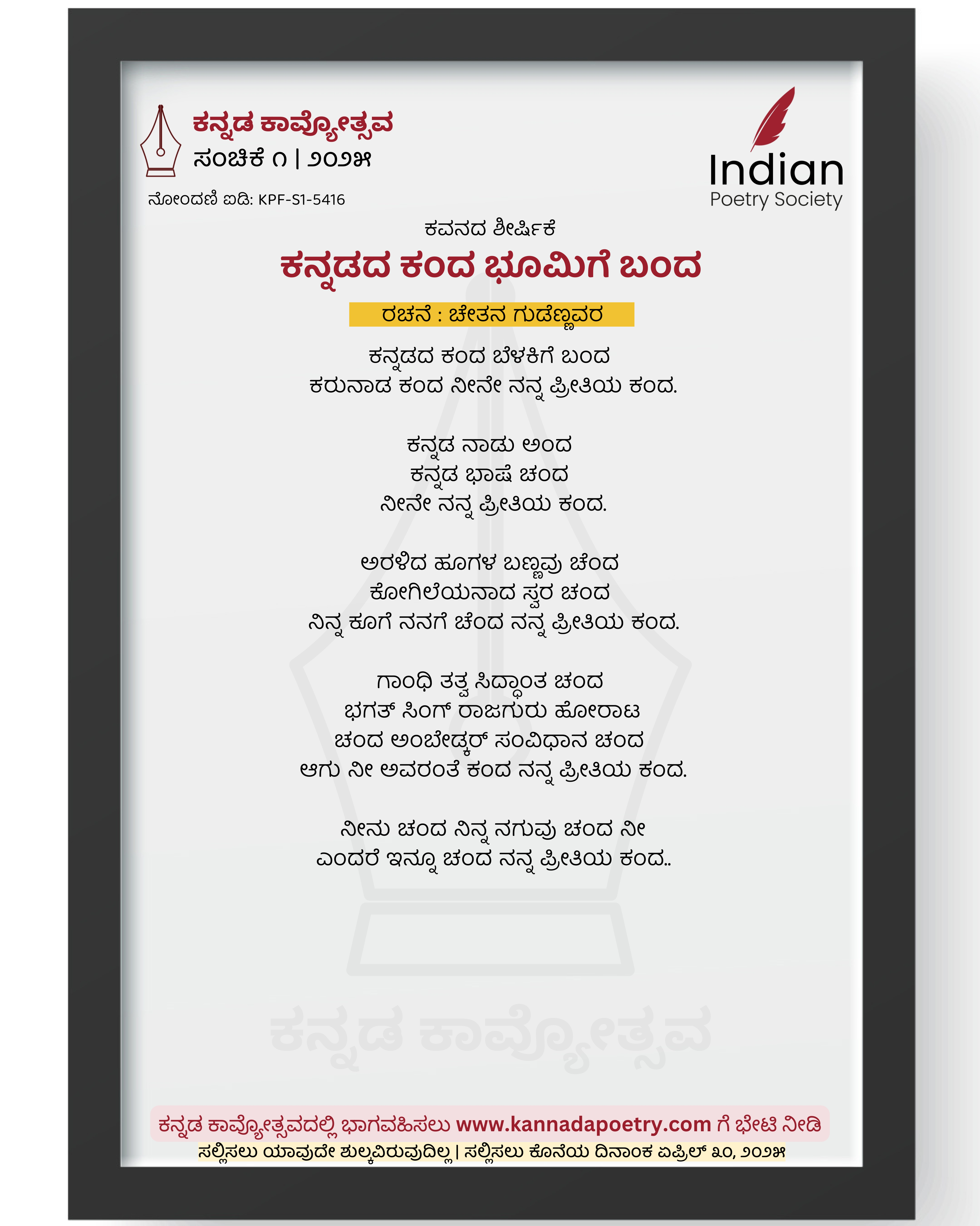 ಕನ್ನಡದ ಕಂದ ಬೆಳಕಿಗೆ ಬಂದ ಕರುನಾಡ ಕಂದ ನೀನೇ ನನ್ನ ಪ್ರೀತಿಯ ಕಂದ. ಕನ್ನಡ ನಾಡು ಅಂದ ಕನ್ನಡ ಭಾಷೆ ಚಂದ ನೀನೇ ನನ್ನ ಪ್ರೀತಿಯ ಕಂದ. ಅರಳಿದ ಹೂಗಳ ಬಣ್ಣವು ಚೆಂದ ಕೋಗಿಲೆಯನಾದ ಸ್ವರ ಚಂದ ನಿನ್ನ ಕೂಗೆ ನನಗೆ ಚೆಂದ ನನ್ನ ಪ್ರೀತಿಯ ಕಂದ. ಗಾಂಧಿ ತತ್ವ ಸಿದ್ಧಾಂತ ಚಂದ ಭಗತ್ ಸಿಂಗ್ ರಾಜಗುರು ಹೋರಾಟ ಚಂದ ಅಂಬೇಡ್ಕರ್ ಸಂವಿಧಾನ ಚಂದ ಆಗು ನೀ ಅವರಂತೆ ಕಂದ ನನ್ನ ಪ್ರೀತಿಯ ಕಂದ. ನೀನು ಚಂದ ನಿನ್ನ ನಗುವು ಚಂದ ನೀ ಎಂದರೆ ಇನ್ನೂ ಚಂದ ನನ್ನ ಪ್ರೀತಿಯ ಕಂದ..